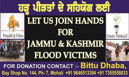 GreenThinkerZ Society and Punjab Up Films organized a week long Donation Camp for the Flood Victims in Jammu & Kashmir at Bittu Dhaba, Phase-7, Mohali in which people donated cash as well as packed food, clothes, medicines in large amount. The camp started on 16.09.2014 and has been successful to kindle the humanity quotient in the society at large in order the help the sufferers in J&K. The Material / Cash collected was sent to J&K by air where volunteers from Sikh Relief, United Sikhs worked day and night to render selfless service to distribute the relief material to the victims in J & K. The camp was highly successful and provided a perfect platform for the noble souls in the society who wanted to help the sufferers. The GreenThinkerZ Society and Punjab Up Films thank all the people who contributed or will contribute for the noble cause.
